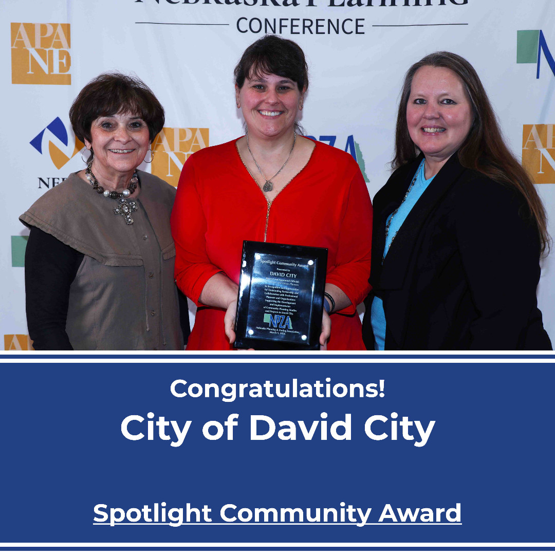 The 2026 Nebraska Planning Conference included award presentations to some very deserving individuals! We’ll be telling their stories one at a time. The City of David City is the recipient of NPZA’s Spotlight Community Award. Over the past five years, the city has completed a public planning and community engagement process for its 2040 Comprehensive Plan update.